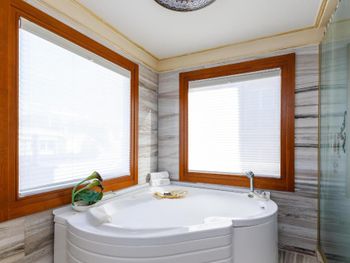 Очень маленькая душевая кабина. Чтобы залезть туда, пришлось прям втягивать живот и прислоняться к холодной стене. Нет обещанного вида на море. Незнаю как, но в интернете вообще отсутствуют фотографии вида из окна. Это расстроило, надеялись все-таки на правдивое описание.