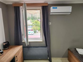 Интерьер самого номера соответствует фотографиям. Одна двуспальная кровать — вполне удобная, но правая сторона заметно продавлена. В номере есть холодильник, чашки для чая и сам чай, но чайника нет — соответственно, каждый раз приходится ходить и просить горячую воду. Ванная комната в целом приличная, однако душ был неисправен: из душевого шланга подтекала вода, из-за чего напор был слабее, чем хотелось бы. Также в комнате есть небольшое окно.