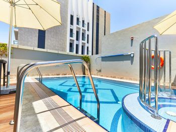 Удобное месторасположение , очень чисто , немноголюдно , бассейн маленький , но скрытая от жары можно ! Не шумно !