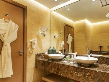 Про еду так же добавить нельзя ничего хорошего: тот "ресторан" который на 9 этаже пропах фаствудом с ужасной мебелью и освещением. Рестораны на первом-просто лучше, чем совсем ничего. Отдельно про рум сервис-первый заказ принесли в пластиковых боксах, еда была остывшей, запросила принести посуду-никто так и не принес. При всех следующих заказах приходилось отдельно акцентировать на тарелки и приборы.