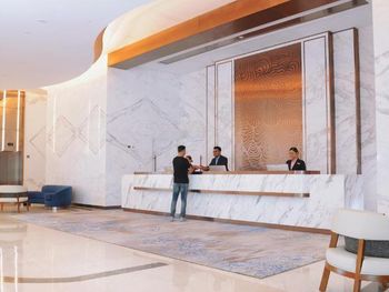 Сотрудники стойки регистрации говорят на арабском, на английском, на французском и на хинди.
