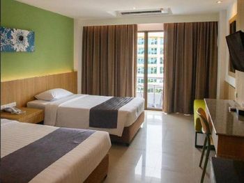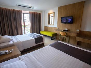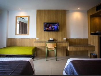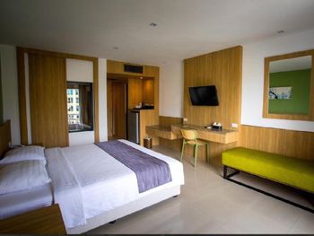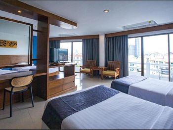 Уютный номер, балкон с видом на город и море за домами, в самом центре Паттайи. Хороший завтрак (за 200 бат за двоих, нужно оплачивать при заселении, выдают талончики). Бассейн. Большая полка под телевизором на всю ширину комнаты, удобно складывать вещи.