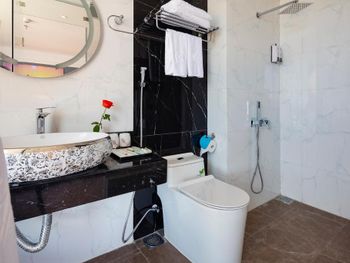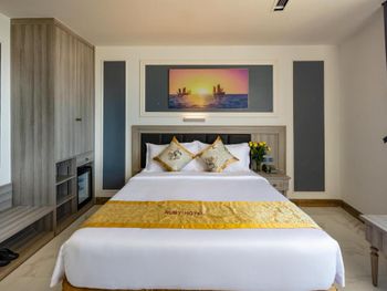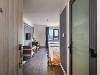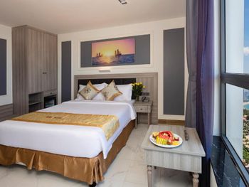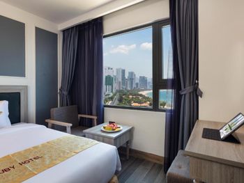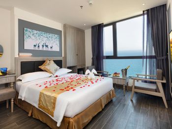 Прекрасный чистый номер с большим панорамным окном с видом на море, красивый вид. Белое чистое постельное белье и полотенца. Каждый день добавляли воду, чай и кофе. В ванной есть шампунь, гель для душа, зубные щетки с пастой, шапочки. Убирались каждый день. Завтрак сытный. Очень отзывчивый и приветливый персонал, хочется отметить молодого человека на ресепшен Vuong и молодая девушка, всегда рады помочь. Мы продлевали номер 2 раза, никуда не захотели ехать. Отличное соотношение цена качество. На улице сразу магазины и массажный салон, песчаный пляж через дорогу.