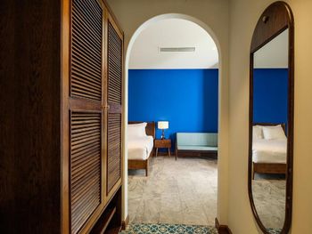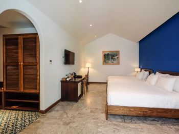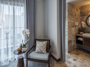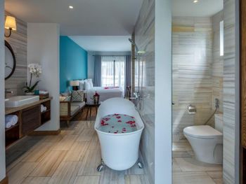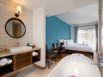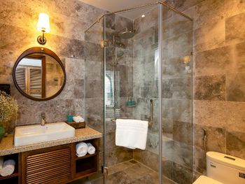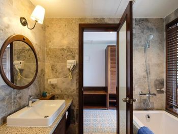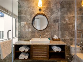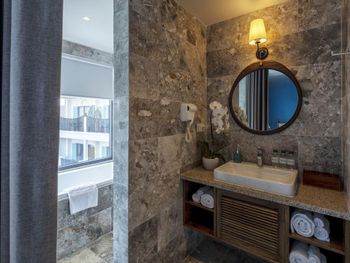 Странная проектировка номера. Ванной комнаты как таковой нет, ванная и раковина прямо в спальне, есть отдельные входы в душ и туалет со стеклянными прозрачными дверями. Это расширяет пространство спальни, но из душевой кабины ты вываливаешься мокрый прямо в центр номера и заливаешь все водой. С унитаза через балкон можно наблюдать за соседями:)