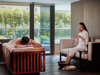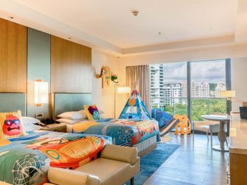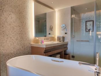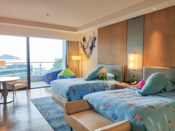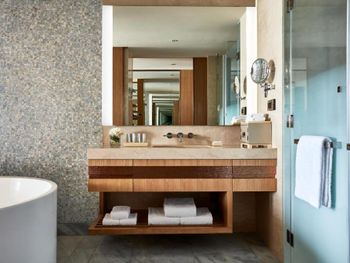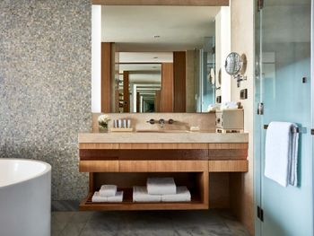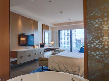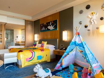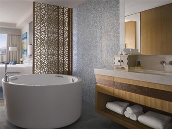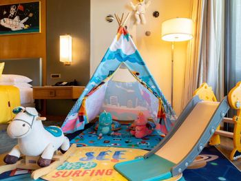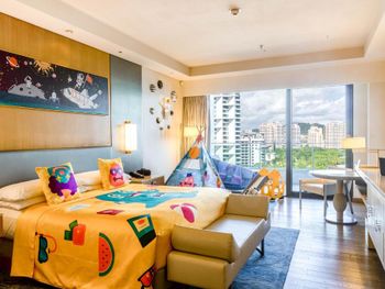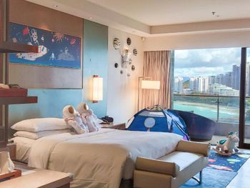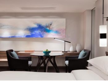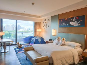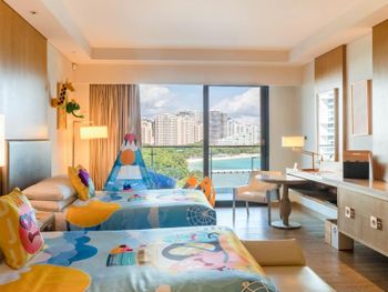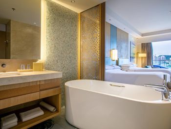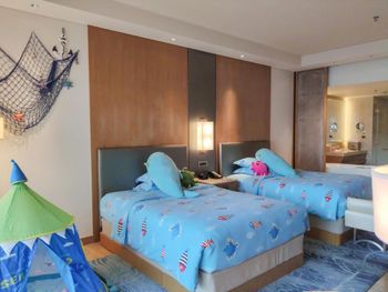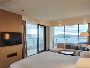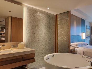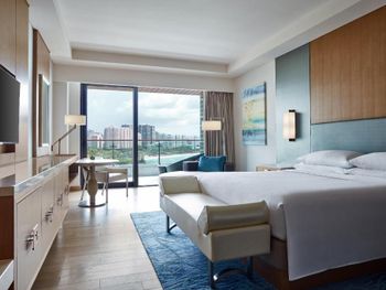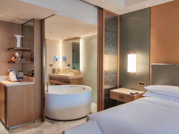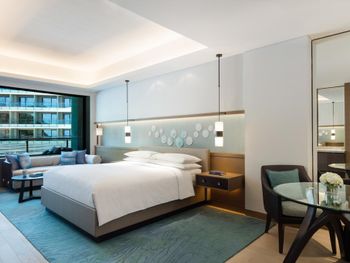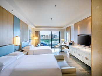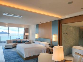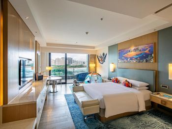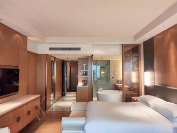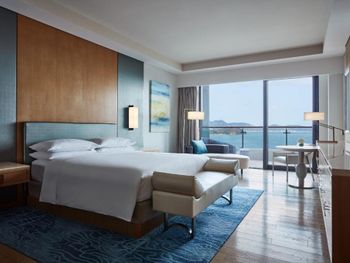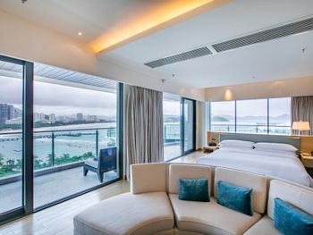 Из просторных номеров отеля JW Marriott Sanya Dadonghai Bay открывается живописный вид на сад. Из некоторых номеров открывается вид на море или горы. В гостиной зоне установлены диван, сейф, телевизор со спутниковыми каналами и мини-бар.