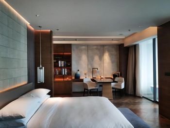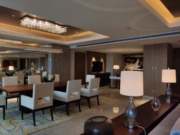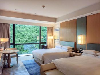 Номер достаточно просторный. Заказывали с видом на горы. Но горы были видны только, когда стоишь у окна, если лежишь на кровати видна только белая бетонная стена. Есть чайник, кофейник, чай, кофе, сахар, туалетные принадлежности, халаты, тапочки, шлепанцы, гладильная доска, утюг. Телевизор показывает канал Россия, RT. Убирались достаточно хорошо, ежедневно. Это из плюсов. Но и много негативного, несмотря, на то, что это все-таки сетевой 5 звездный отель. Началось все за 2 недели до заезда. Написала в отель, по-поводу трансфера. Ответа не последовало. Хотя он заявлен. Написала 2 раз - ответа нет. В итоге за сутки до отъезда уже обратилась в букинг, где очень оперативно за несколько часов сообщили, что трасфер данный отель уже не предоставляет и предлагает доехать на такси за 80 юаней. Приличные отели не пишут недостоверную информацию и не вводят клиентов в заблуждение. Хотя после отъезда отель надоел мне присылать анкеты, кот. я терпеть не могу и никогда на них не отвечаю. Когда заезжали то в качестве залога предложили 100 долларов. Минут 15 наблюдали, как сотрудник ресепшена чуть ли не обнюхивает и просвечивает каждую купюру, одну забраковал, т.к. она была 2003 года выпуска. Предлагали евро - отказались. В итоге пришлось менять эту купюру. В целом завтрак нам понравилось, т.к. мы любим экспериментировать со своими желудками и кишечника нам не жалко. Была и корейская и китайская кухня и разнообразные булочки. Наподобие еврозавтрака были яичница, бекон, овсянки. Никаких морепродуктов нет. Но и там вышел негативчик. Был день великого заезда местных китайцев, которые не могут подождать, когда их сотрудник зала доведет до стола. Они садятся сами.