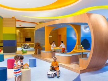 Очень красивое фойе, отличная детская игровая, разнообразный завтрак, стильное оформление отеле, приятная зона с растениями возле детской игровой