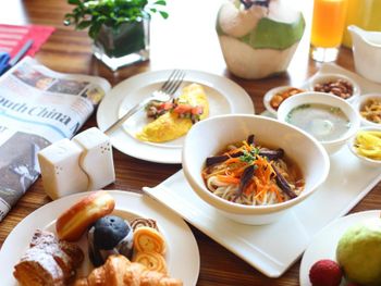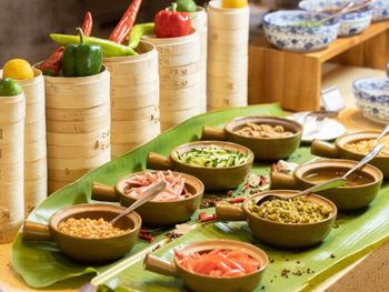 Отвратительный завтрак, я совсем не против традиционного китайского завтрака, но ведь это нужно постараться приготовить китайский жидкий рис невкусно, персоналу столовой этого ресторана это удалось. Вообще завтрак устраивается в кафе этого отеля, но по сути этот ангар можно назвать только столовой, уродливые непонятного цветакружки из икеи усиливают это впечатление. Кроме очень ограниченного выбора еды, сама еда невкусная и плохого качества, нет овощей в свежем виде, а те что приготовлены плавают в таком количестве масла, что вкуса там не распробывать. Уборка в номере убежает в своем наличии тем что на полу остаются разводы и лужи воды. Сама территория красивая, но довольно неухоженная, много сухих растений, шум от идущего ремонат