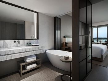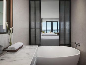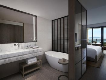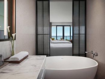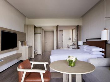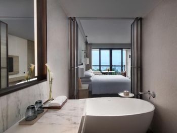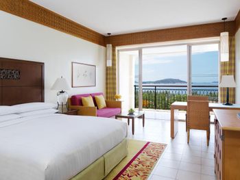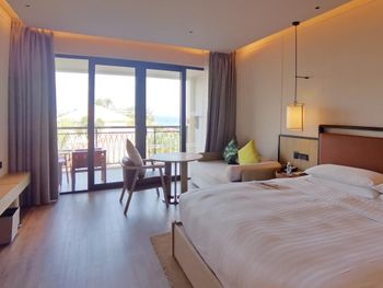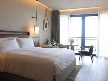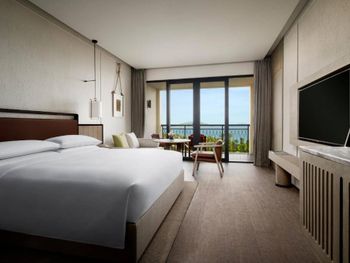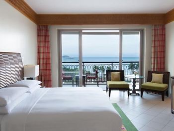 Прекрасный номер с большой ванной и балконом, удобно, что туалет отдельно. Каждый день дополняли воду, хорошая уборка. Отличный разнообразный завтрак, как европейский, так и китайский. Прекрасный пляж, всегда были свободные лежаки. перед пляжем выдают подогретые полотенца. Приятный аромат в фойе. Приветливые сотрудники.