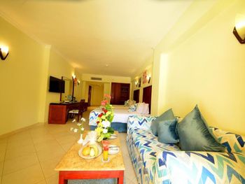 не вкусная еда, убитые номера, везде какие-то мошки, муравьи и комары. в номере убирались поверхностно, только застилали постель, и подметали, забирали мусор. грязные шторы в номере, плесень и грибок в туалете, вся мебель просто на соплях. полотенца меняли только по просьбе, после уборки номера грязные забирали а чистые приходилось просить, приносили быстро, но при этом намекали на чаевые. в номере не было кофе, только пару пакетов чая и сахара за все 5 дней проживания. система была все включено, приносили фрукты и местные сладости, колу и спрайт. еда в столовой просто ужас, однообразно и не вкусно,сыпали по ложке, когда просили добавки, смотрели вызывающе. обслуживание просто кошмар. при этом все хотят чаевых. воду в номер приносили регулярно, но пить ее невозможно, вода не вкусная. пляж грязный, в море купаться у берега нереально, грязь, идти по мосту по жаре далеко, с ребёнком тяжело, ни разу так и не дошли до конца моста чтобы понырять с масками.после посещения ресторана китайской кухни, вся семья сидела сутки в туалете((((((вай Фай ловит только на ресепшн, и то не всегда. просили купить доступ к вай Фай , чтобы везде ловил, отказали. очень навязчивые гиды, прям чересчур, невозможно было находиться у бассейна, навязывали экскурсии и другие виды развлечений, на просьбы не беспокоить не реагировали.