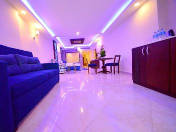 Пол в номерах выложен плиткой. В числе стандартных удобств — телевизор с плоским экраном, гостиный уголок, мини-бар и балкон. За дополнительную плату можно пользоваться стиральной машиной и гладильными принадлежностями.