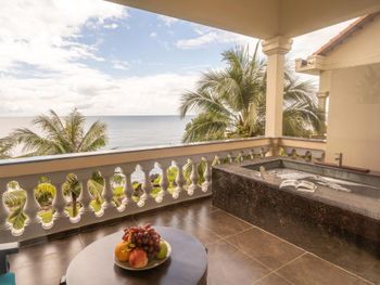 Расположение самого отеля в деревне добираться только на скутере или машине. Выбрал домик с видом на море и ванной на балконе. В результате дали домик зажатый между двух других таких же но у них бассейн на балконе. В итоге я вижу соседей они меня никакой интимности (смотрите фото), а вид на море классный но внизу стоит ресторан. Мой совет берите домики на пляже! Вход в море очень не удобный камни водоросли надо проходить метра два три потом нормально. Можно было и очистить хоть несколько метров для захода в море.