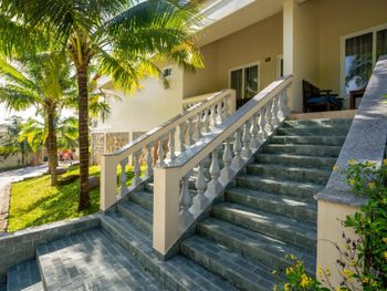 Жили в двухэтажном корпусе, номер сильно уставший, грязь на вентиляторе, пыли много. В ванной плесень в углу Отвратительно работал WiFi в номере Завтраки однообразные Администрация не предоставляет услугу, чтобы гольфкары возили до ворот отеля - очень крутой подъем и спуск делают очень некомфортной дорогу в/из отеля