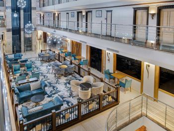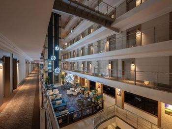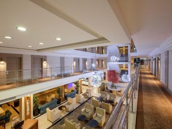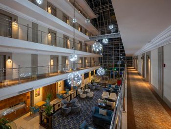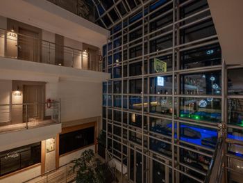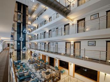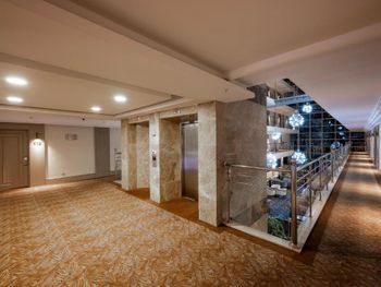 Соседний корпус относится к гостинице 2 звезды. Высокие непрозрачные ограждения коридоров в атриуме, ощущение, будто в тюрьме из американского боевика 90-х годов.