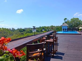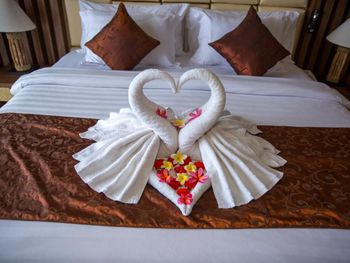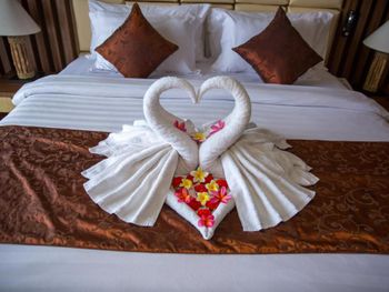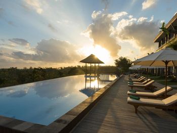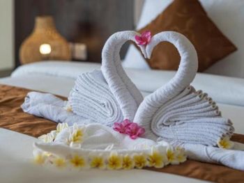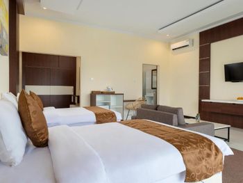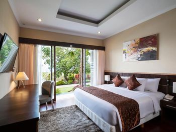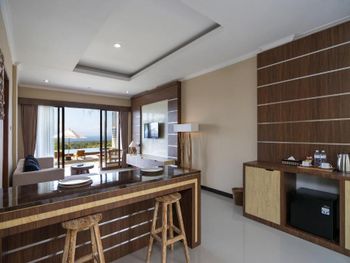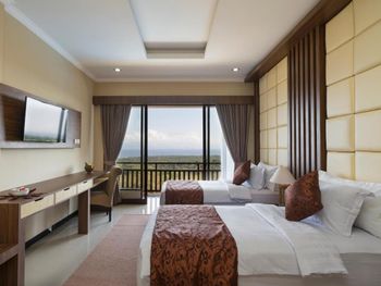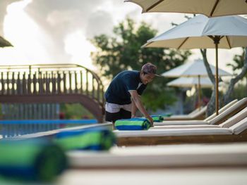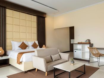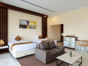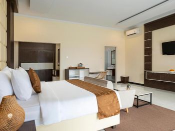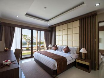 Отель вообще не соответствует 4 звездам. Максимум - две звезды. Он весь обшарпан, местами штукатурка отваливается. Мы бронировали лучшее, что у них есть - виллу с двумя спальнями, заявлено что 300 кв метров. На самом деле, это обычный номер и отдельная пристройка сарайчик с двумя кроватями, тапочек нет, вода из душа и в кранах не течет толком. В ящике стола обнаружили засохшую еду. Мебель ободрана. Полотенца и белье - не белые, а грязно желтые, и влажные. Мы до этого жили на настоящих виллах по всему Бали со средней ценой 100$ в сутки. В этом ужасном отеле цена 200$ в сутки, а качество в 10 раз хуже. Я не советую туда ехать никому и никогда, если не хотите пережить разочарование. Я уж про еду молчу - готовят они паршиво. Одно только радует, что всего две ночи пришлось потерпеть, потом свалили оттуда в приличное место.