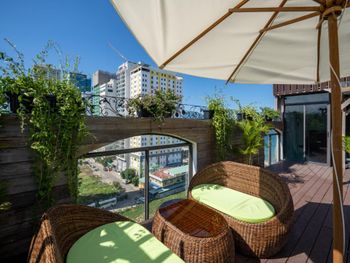 Минусы (увы, их больше): 1. Брали номер с балконом. От балкона одно название, по факту это просто микро отросточек, куда ни выйти, ни повесить сушиться вещи нельзя. Абсолютно бесполезная опция. 2. Все номера с балконом выходят на улицу с барами, музыка играет до самого утра, заснуть очень сложно. Даже на верхних этажах (мы жили на 11) всё слышно. Про вечер пятницы я вообще молчу, прямо под окнами концерт живой музыки. Слышно его настолько отчётливо, будто я сама в баре сижу. Уснуть НЕРЕАЛЬНО. 3. Огромные проблемы с водой в душе. Напор ужасно слабый, вода либо ледяная, либо кипяток, среднего не дано. Мыть голову приходилось в самые непопулярные часы (например утром), чтобы напор был получше. 4. Бссейн не крыше супер маленький и грязноватый. Плюс в середине нашего отпуска закрылся на ремонт 5. В ванной за раковиной была плесень. 6. Сплит система ужасна, дует прямо на одну из кроватей. Приходится либо страдать от жары ночью, либо молиться на то, чтобы не простыть. Спойлер, мы простыли и неделю ходили с соплями и больным горлом. 7. Наконец, насекомые. По всей комнате микро муравьи (или что-то похожее на них). Они буквально повсюду, в ванной, в комнате, даже на кровати. Все вещи приходится вытряхивать, так как на них залазят эти насекомые. Фрукты вообще оставить нельзя. В целом, мнение очень неоднозначное, но второй раз бы я точно сюда не вернулась. Кажется в Дананге не проблема найти варианты получше за ту же цену.