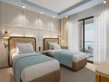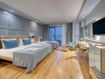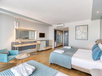 Сам объект уже старый и кресла, мебели грязные. Семейные номера маленькие и все принадлежности старые. Полотенца чистые приносят и воняют. Изношенные все. Все время что то не хватало. Кондиционер для волос не было когда принесли вовсе не тот…. Уборка вообще слабо убирает. Еда выбор мало. Десерты одни и те же. Каждый день повторялись. Бассейн грязный. И кстати море тоже было чуть грязновато так как было ого рождение камнями и когда катера ездят вся масла по воде было