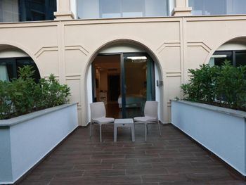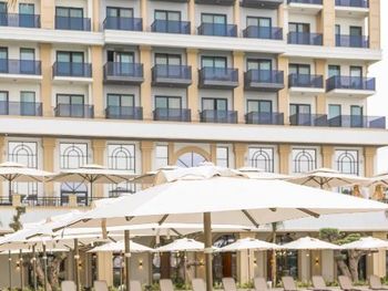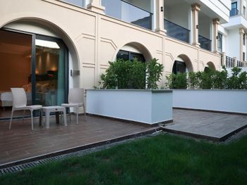Ухоженная территория, много зелени, собственный чистый пляж. Из-за волнореза там было спокойно (без больших волн) и чисто по сравнению с соседними пляжами.