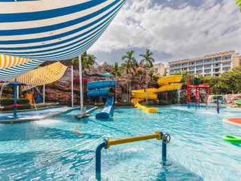 Огромная зелёная территория,прекрасный персонал,шикарные завтраки. Жили в первом корпусе ,все было рядом. Бассейн,море,спортзал,детская комната,водные горки. Очень было удобно. По территории передвигались на электромашинах. В километре находится аквапарк Атлантик,недалеко дьюти фри.