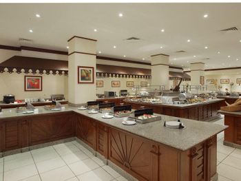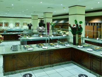 В «ресторане» тихий ужас. Спасибо «ковидным мерам», еду теперь накладывают повара из-за стеклянной перегородки, что способствует огромным очередям. Скудность еды вызвала просто сильнейшее огорчение. Напитки наливают в пластиковые стаканчики по 150мл, это конечно нонсенс для ресторана. Гости сидят со своими бутылками из дьюти фри.