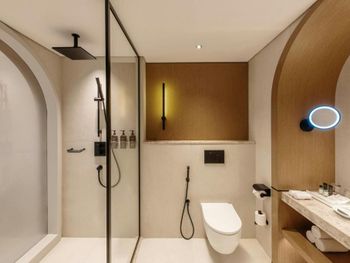 Отсутствие балкона в номере. Слабый напор воды в душе. Кофе на завтрак из кофемашины в отеле 5 зв не ожидал! Можно и от бариста, но за доп плату 26 дирх - скидка 20% для гостей отеля из кафе в лобби. Мебель в номерах с видом на город убитая!!! Предложили доплатить и взять номер с видом на море. Там все ок. Еда не очень и много острых блюд, но выбор есть и можно выбрать что то сьедобное. Креветки на гриле - каша в панцыре, просто ужас! Дыни твердые и невкусные. Сам отель тянет на 4 зв. В лаунж баре пытались надуть - принесли 2й ром, хотя заказывал 1й. Так что уточняйте у официанта, что он принес.