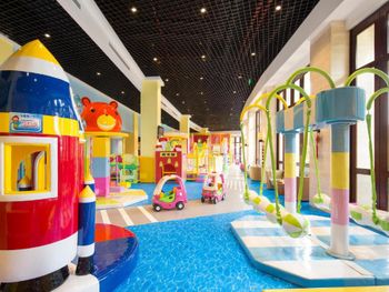 The resort has a 718 square metre children's playground with a magician course for children, 11 swimming pools, a farm, a jungle exploration camp, water park, fish pond and a peacock garden. There are also island cute baby playground, parrot theater, family bicycle and dinosaur locomotive for family entertainment during the stay. Trip photo shooting service with professional photographer is also available for guests.