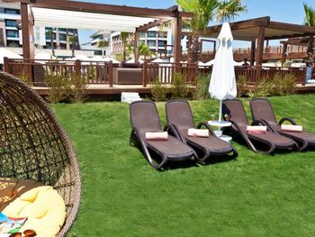 Есть шезлонги на траве это очень удобно для отдыха с малышами.
