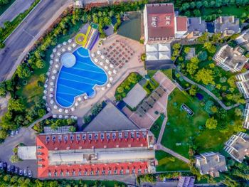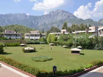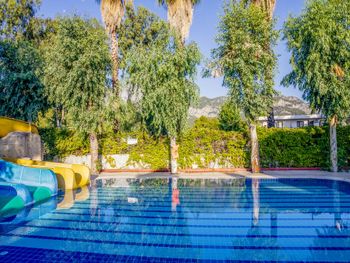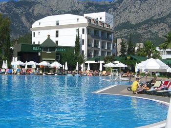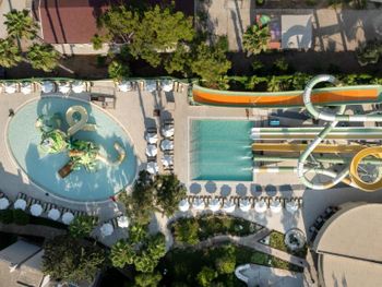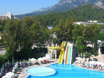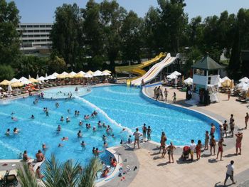 - Ухоженная, зелёная территория с несколькими бассейнами. На территории есть небольшой, но довольно интересный аквапарк с шестью горками.