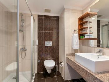 Душ сделан таким образом, что там только одна стеклянная стенка, хотя напрашивается еще одна. В результате вся вода после принятия душа оказывалась на полу ванной.