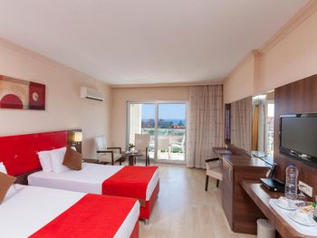 Очень удивило то, что нам дали номер очень маленький и на первом этаже. Хотя мы заказывали номер 22 кв. м с балконом. По поводу балкона показали на два стула, стоящих перед окном, и сказали, что это балкон. Когда мы попросили поменять номер, нам дали номер, который размещен на фото в booking.com, но потребовали доплату 60 долларов США. Расположение отеля не очень удачно: с одной стороны дорога, по которой постоянно ходит транспорт, с другой (вид красивый на бассейн и кусочек моря), но очень часто очень громкая музыка из соседнего отеля, а с 21 до 23:30 анимация в этом отеле, громкость такая, что бьет по ушам. Очень маленькая территория: одна дорожка вокруг бассейна. В бассейне холодная вода. На завтрак всегда одно и то же.Через неделю уже ничего не хочется. Реально по-русски можно говорить с одним человеком-менеджером. Все говорят только по-немецки.