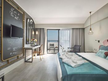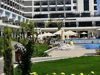 Красивый отель. Дизайнеры постарались. Номер оформлен нестандартно. И в общественных местах - то всё как у всех, то большой портрет серьезного кота в пенсне или в проходе люстры в виде больших белых шляп-цилиндров. Приветственное шампанское- приятный момент. С питанием неплохо: курица- рыба-баранина- всё всегда в наличии. Много холодных закусок. Отсутствие детей в отеле очень положительно сказывается на отдыхе. Пляж в трех минутах ходьбы. На нём чисто, приветливый стафф и опять-таки нет детей. С 11 утра на пляже напитки, гезлеме, айран, фрукты. На балконе номера стол со стульями и сушилка для белья. Если вы на авто, то для стоянки автомобиля места достаточно