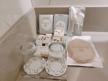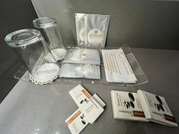В ванной комнате много полотенец, гель для душа, шапочки, маленькие тюбики с кремом для тела, фен.
