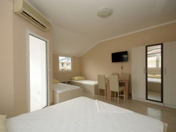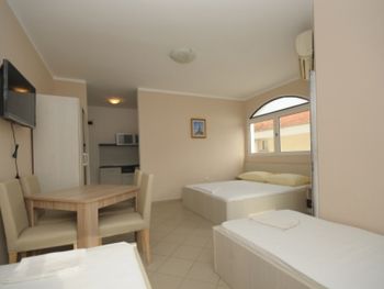 Studio 03+1: около 35м2 +терраса 5м2, французская кровать и раскладной диван (либо две отдельных кровати), мини-кухня, душевая кабина.
