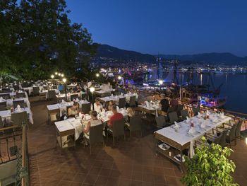 В известном ресторане Kaptan с обслуживанием по меню предлагаются блюда интернациональной и турецкой кухни. По утрам в зале, из окон которого открывается панорамный вид на окрестности, сервируется обильный завтрак «шведский стол».