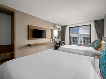 Удобное расположение объекта, не центр, но и не край географии. Отель относительно бюджетный, это и плюс и минус. Номер относительно чистый. В холле отеля чисто и приятно. Приятные сотрудники на ресепшне. Матрас достаточно удобный. Рядом достаточная инфраструктура. Есть приличные кафе по близости. До пляжа перейти дорогу. Шведский стол на завтрак. Наличие небольшого спортзала. Возможность арендовать байк в отеле за 130к на сутки. В номере каждый день убираются, приносят чай, кофе и новые полотенца. Но уборка очень поверхностная.