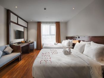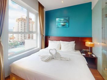 Номер просторный с 2 двуспальными кроватями, подушки мягкие. Кондиционер индивидуальный, что очень удобно, т.к. на ночь окно не откроешь. Ванная комната достойная, чистая, все принадлежности есть, чего не было - докладывали. есть холодильник, сейф, фен. все отлично и выглядело достойно. места предостаточно. Затврак был разнообразный каждый день. Была и местная кухня, и европейская(паста, пицца). Суп фо - просто бесподобен. Каждое утро начиналось с него! фрукты, десерты - все было очень вкусно!) Персонал очень отзывчив и всегда готов помочь. при заезде вам дают сок и фрукты. Фрукты периодически приносили в качестве комплимента в номер!) очень приятно! Мы в отеле брали индивидуальную экскурсию на Ba Na Hills. по деньгам вышло то же самое, как и групповая. Отель находится в туристическом райончике, вокруг много лавок, кафешек и ресторанов. в 2 км от отеля - ночной рынок с едой, очень вкусно. до Пляжа минут 10, пляж чистый, широкий и с лежаками(40 тыс донгов за лежак). Море шикарное! Полотенца выдавали в отеле, что очень удобно!