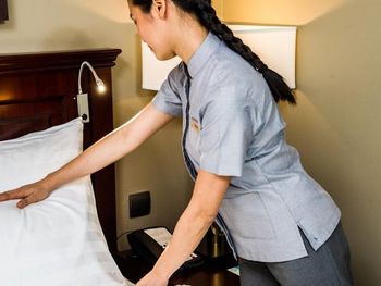 Администратор пытался обмануть и продать номер по завышенной цене. Отсутствие элементарных одноразовых тапочек в номере. Холодные полы.