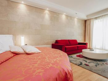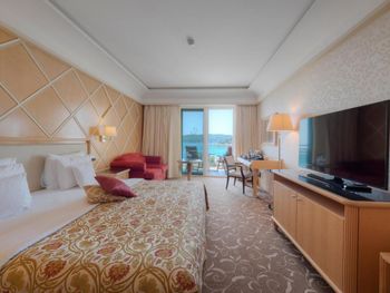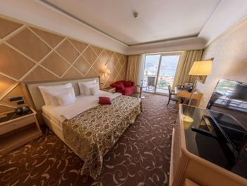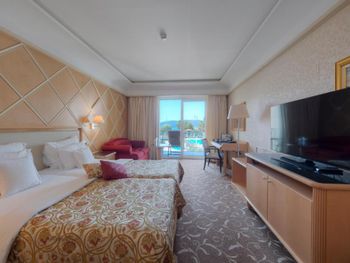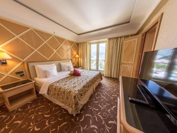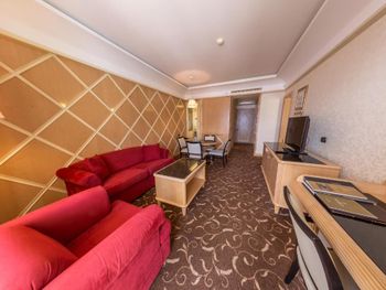 Ожидал большего! Приобрел номер люкс для своей семьи. Номер требует частичного освежающего ремонта и наведением определённого порядка (плохо работала канализация, шторы не полностью защищали номер от первых солнечных лучей, механизмы открывания и закрывания штор не работали, воду, сахар и капсулы для кофе-машины приходилось выпрашивать ежедневно) Приносили 1 бутылку на всю семью. Приходилось бегать в соседние магазины.