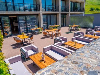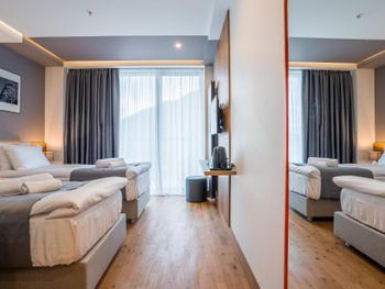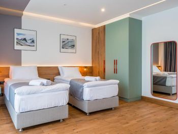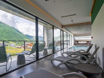 Территория отеля не расчищена от снега. Террасы, балконы завалены снегом, вход в гостиницу не расчищен, постояльцы заходят в отель по тропинке, которую сами протоптали в снегу. Бассейн грязный. Семейные номера находятся в цокольном этаже, поэтому вида с них нет, перед окнами стоят домики и все перекрывают. Поэтому учтите это при бронировании.