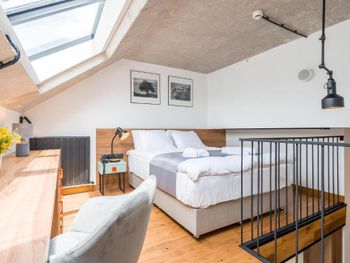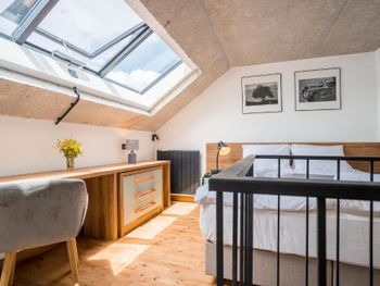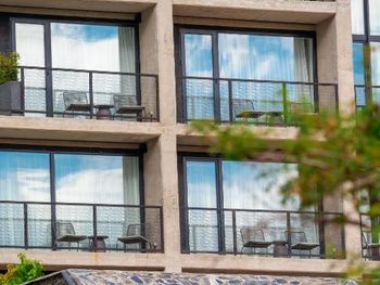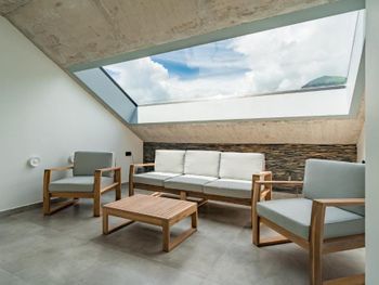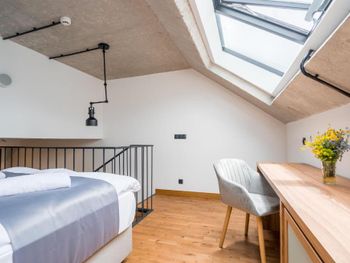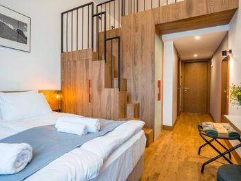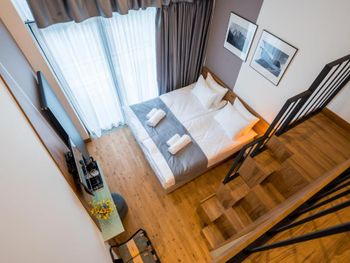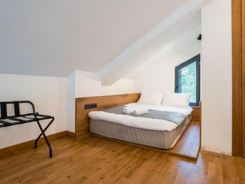 Брали семейный номер. Это цокольный этаж, вид из гостиной на стену впереди стоящего коттеджа. Есть шезлонг на лоджии (только вида нет). Спальня на втором этаже с мансардным окном. Штор на окне нет: солнце слепит глаза, если решил днем поспать. Очень странное расположение кровати- бочком протискиваться ко второму спальному месту. Из душевой вода вытекает на пол, практически потоп. Утром решили позавтракать в отеле. На ресепшене в 08:00 никого не было, кухня закрыта, персонал разводит руками