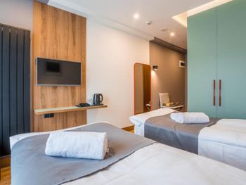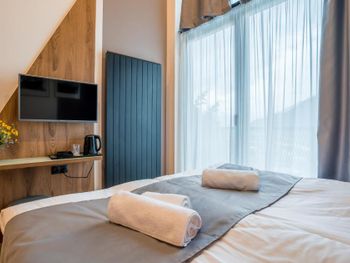 Были в семейном номере. Отдыхали парой вместе с котиком. В самом номере очень понравилась кровать, довольно удобный матрас. Также в номере довольно много места, ванная комната средних размеров, есть небольшой холодильник и чайник, что очень удобно. В самом отеле есть бассейн с теплой водой, не хотелось оттуда выходить. Также сауна за дополнительную плату. Есть ресторан, очень удобно, не нужно куда-то выходить, особенно после сауны и бассейна. Персона очень вежливый.