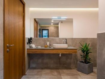 Вход в отель со строящейся парковки. Найти вход ночью почти невозможно - все огорожено забором и не найти калитку. Проход к отелю через калитку которая расположена на фундаменте из бетона, поэтому чемодан лучше сразу оставить в машине. НОМЕР. Из окна есть вид на гору, но его нет, потому что прямо перед окнами три домика. Мы жили на 1 этаже (СЕМЕЙНЫЙ НОМЕР). Кровати двуспальные, но почему-то 150 см - места мало, но несмотря на это постель комфортная. Вай фай в номере не работал, хотя и плохо ловил. ТВ тоже привязан к wi-fi поэтому ожидаемо не работал. ЗАВТРАК. Должен быть в 8.30, но в это время на столе лежал только один вид ветчины и больше ничего. Реально он был готов к 9.00. Персонал особенно внимания на это и на гостей не обращает. Сам завтрак очень простой, лично я остался голодным. В наши дни кофемашина не работала, поэтому кофе был... растворимый. Свежих соков нет.