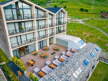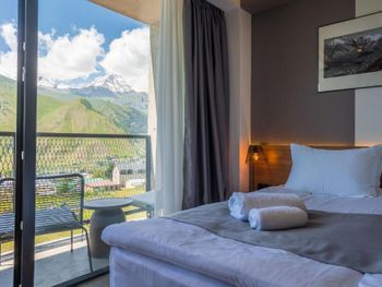 Плюсы отеля: - Очень хорошее расположение, - шикарный вид, - чисто, - тепло в номерах Теперь о минусах и о том, почему не советую сюда ехать: - бассейн на столько маленький, что больше 4 человек там не поместятся; - сауна еще меньше (на одного человека), включается только по запросу и стоит 70 лари - в ресторане ждали официанта 30 минут, два раза звали. За 25 лари вам принесут 5 размороженных хинкали из Спара (не шучу и не утрирую). Кухня - просто ужас!!! - ну и на десерт: если вы попросили и вам подтвердили номер с одной двуспальной кроватью, то значит вам просто сдвинут две односпальные кровати и поставят их рядом. А вы будете проваливаться в дырку между кроватями всю ночь Итог: не имеет ни какого смысла платить за этот отель: либо езжайте в румс, либо возьмите любой другой отель по цене в полтора-два раза ниже этого