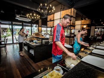 К отелю прилегает кафе в балийском стиле, где подаются завтраки. А средь дня и вечером невероятно вкусное меню и хорошее обслуживание. Кафе Kiri, очень нравится. Расслабляющая атмосфера, красивое оформление люстр и безумно вкусные блюда (особенно жаренный кальмар и осьминог), подарят вам тотальное ощущение отдыха, которое вы заслужили.