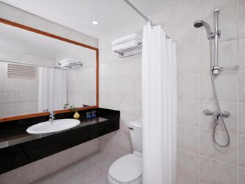 Устаревший номерной фонд. Старое оборудование номера. Кондиционеры шумят и не остужают. Сантехника старая, белье рваное. Тропический душ из копеечной лейки в каменном мешке. Ванная за клеёнчатой шторкой.