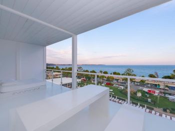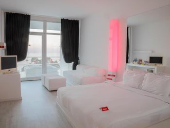 Интересный интерьер, хорошие завтраки со свежевыжатыми соками, бесплатный вход в аквапарк, частный пляж с лежаками и зонтиками, расположение на набережной