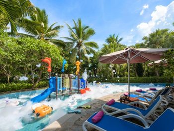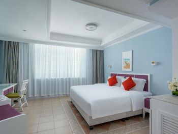 Плавали даже в тот день, когда был тайфун Яги и выходили только когда дождик шел ( с ребенком). Бассейна у них 3. Есть глубокой,средний и мелкий 45 см глубина, типо с горкой. Но все очень старое. Плавать можно, но любители эстетики и новизны - всплакнут. В мелком и вовсе из обещенных 45 см, было на 10 см меньше, стояла старая потрёпанная горка, но вот малышам 1 -3года самый раз. Лягушатник, может так задумано 🤷 Ещё предполагается огромная зона с рыбками, но она была не ухоженная, скорее местами без воды , но с тиной. Мы тоже не поняли почему так, если не смотреть вниз, а только наверх 😂👍"с пивом сойдёт " Сам номер ( мы перед заездом хотели поменять на получше и смотрели много номеров разных категорий) и они все одинаковые примерно. Отличались количеством кроватей( был даже двухэтажный), ещё ковролин или кафель, есть балкон или нет. И куда вид этого балкона. От этих параметров цена резко увеличивается или падает. Однако! Все номера одинаково старые, отель 2003 года, вся мебель была раньше плетёная, а сейчас ее просто перекрасили неаккуратно белой и бирюзовой краской. Это очень сильно дешевит. Такое же встречали в Тайланде в отеле 3 звёзды и были неприятно удивлены, что 5 звёзд тоже так делает. Дверь в ванной также перекрашена, старый кафель в ванной и старый по углам герметик. Старый телек, очень старый шкаф. Есть холодильник, зеркало, стол, стулья, все тоже старое.Но! Матрац - отличный, потрясающий. Белье наисвежайшее как все полотенца и ежедневная уборка выше всяких похвал. Расположение отеля удобное, рядом можно хоть пешком по песку до самого Ананаса (местный ТЦ) хоть по клубам, хоть купаться, также фрукты, кафешки, пляж...все рядом. Все светится, все пестрит ночью. Красота да и только. Очень красиво место.