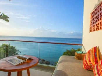 Вид из номера был умопомрачительным. До пляжа два лестничных пролета.