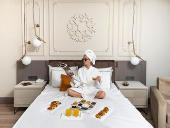 Мы приезжали на годовщину нашей свадьбы.В лобби нас встретил приветливый и вежливый персонал. Нас заселили на час раньше, чем положено. Предоставили удобный чистый номер с красивым видом на бассейн. С отличной климатической системой,которая во сне не будила и не создавала шум. Удобные матрасы позволяли хорошо выспаться. Подарили в честь годовщины ужин в платном ресторане а-ля карт с турецкой, узбекской кухней. Было очень вкусно!