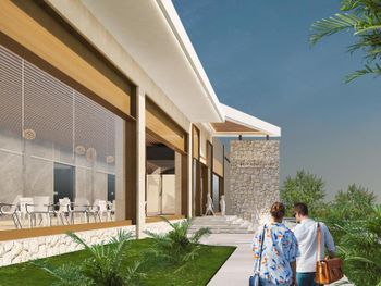 Маленький отель с отсутствием своей территории и зелени на ней. Все в бетоне и в очередях из людей. Пляж ужасный, из гальки и огромных булыжников. Голыми ногами заходить очень трудно.